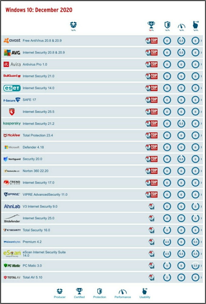 Prema istraživanju vrhunske odlike imaju: Microsoft Defender 4.18, Kaspersky Internet Security 21.2, AVG Internet Security 20.8 & 20.9, Avast Free AntiVirus 20.8 & 20.9, McAfee Total Protection 23.4, VIPRE Advanced Security 11.0, Trend Micro Internet Security 17.0, Norton 360 22.20, Northguard Security 20.0, G Data Internet Security 25.5, F-Secure SAFE 17, ESET Internet Security 14.0, BullGuard Internet Security 21.0, Avira Antivirus Pro 1.0.