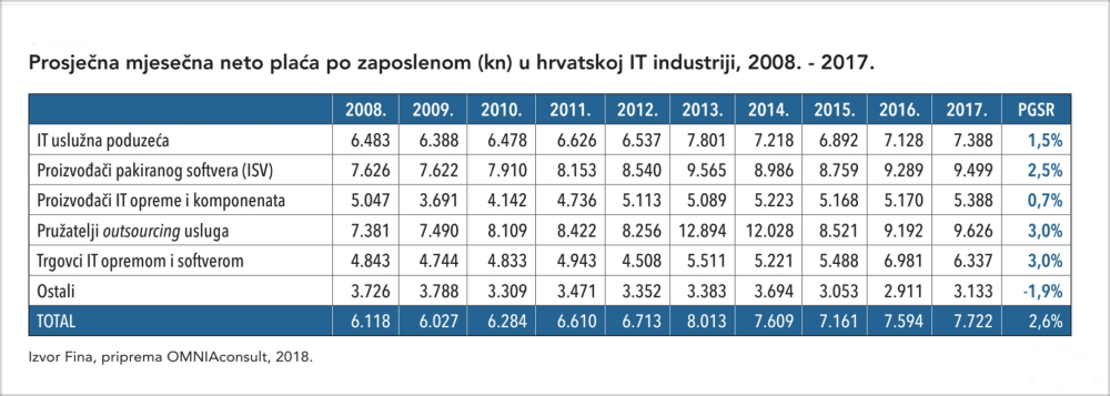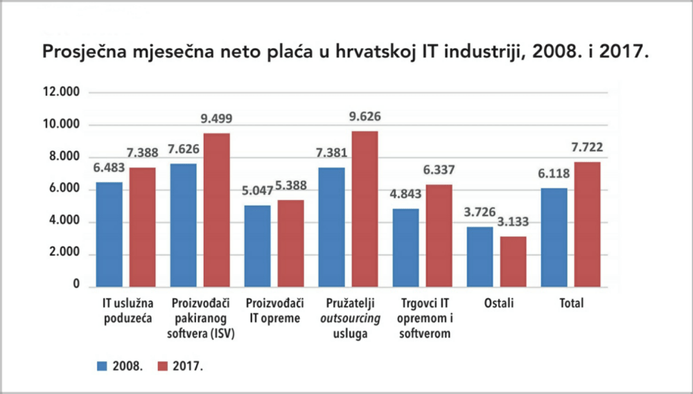 Prosječna mjesečna neto plaća u hrvatskoj ITI-i u 2017. godini iznosila je 7722 kune.