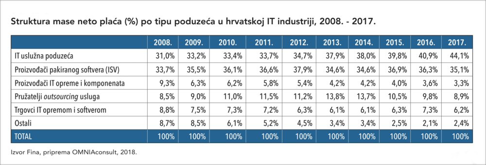 Gledano prema kategorijama IT industrije, najvišu neto prosječnu plaću, 25 posto višu od prosjeka, isplatile su kompanije pružatelji outsourcinga IT usluga. Više neto plaće od prosjeka bile su i u kategoriji softverskih vendora. Najniže neto plaće zabilježene su kod proizvođača IT opreme i ostalih IT tvrtki.
